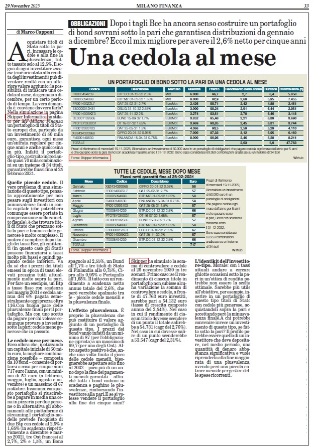 | IT0005654642 | BTP.OT 01-10-30 2.7% | EUR | Mot | 26431 | 100.660 | 2.56 | 2.22 | 2.22 | 1000 | 25-02-2026 |