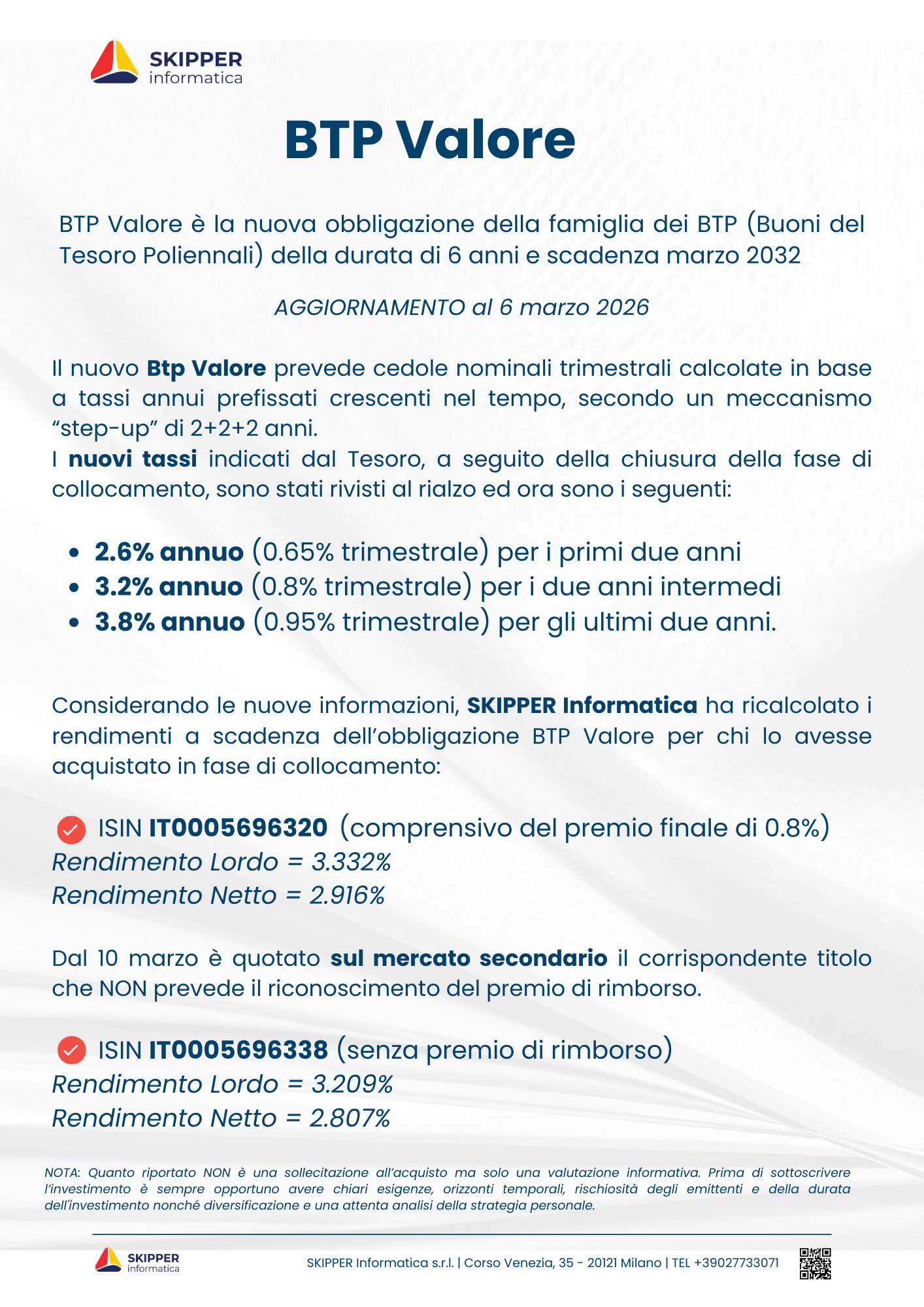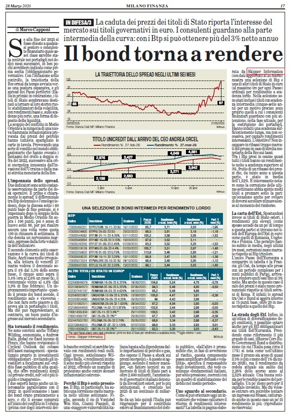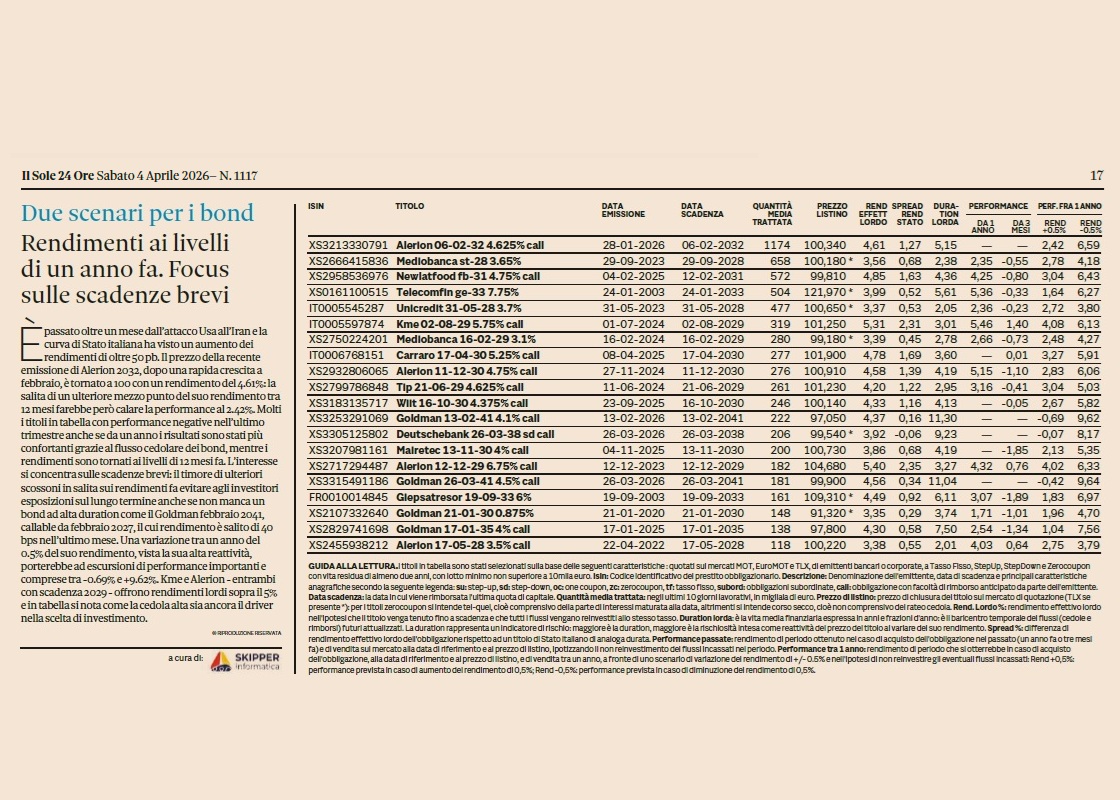 | IT0005699340 | BOT.MZ 12-03-27 A | EUR | Mot | 23126 | 97.690 | 2.60 | 2.29 | 2.27 | 1000 | 10-04-2026 |
