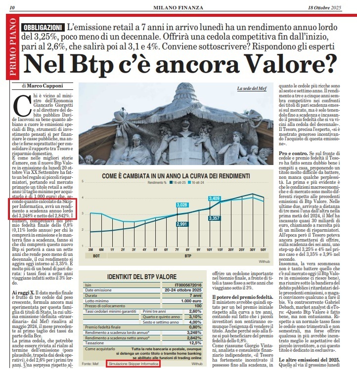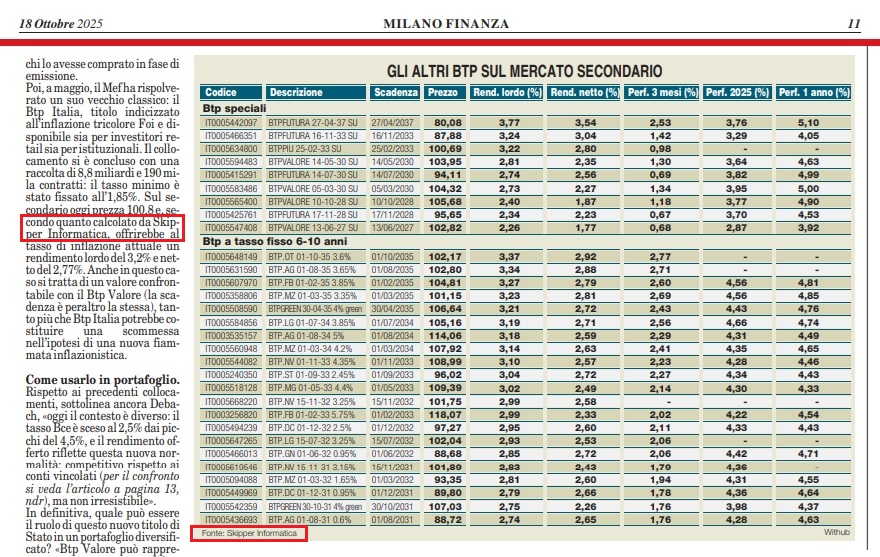 | IT0005672024 | BTPVALORE 28-10-32 SU | EUR | Mot | 12686 | 100.500 | 3.09 | 2.69 | 2.69 | 1000 | 25-02-2026 |